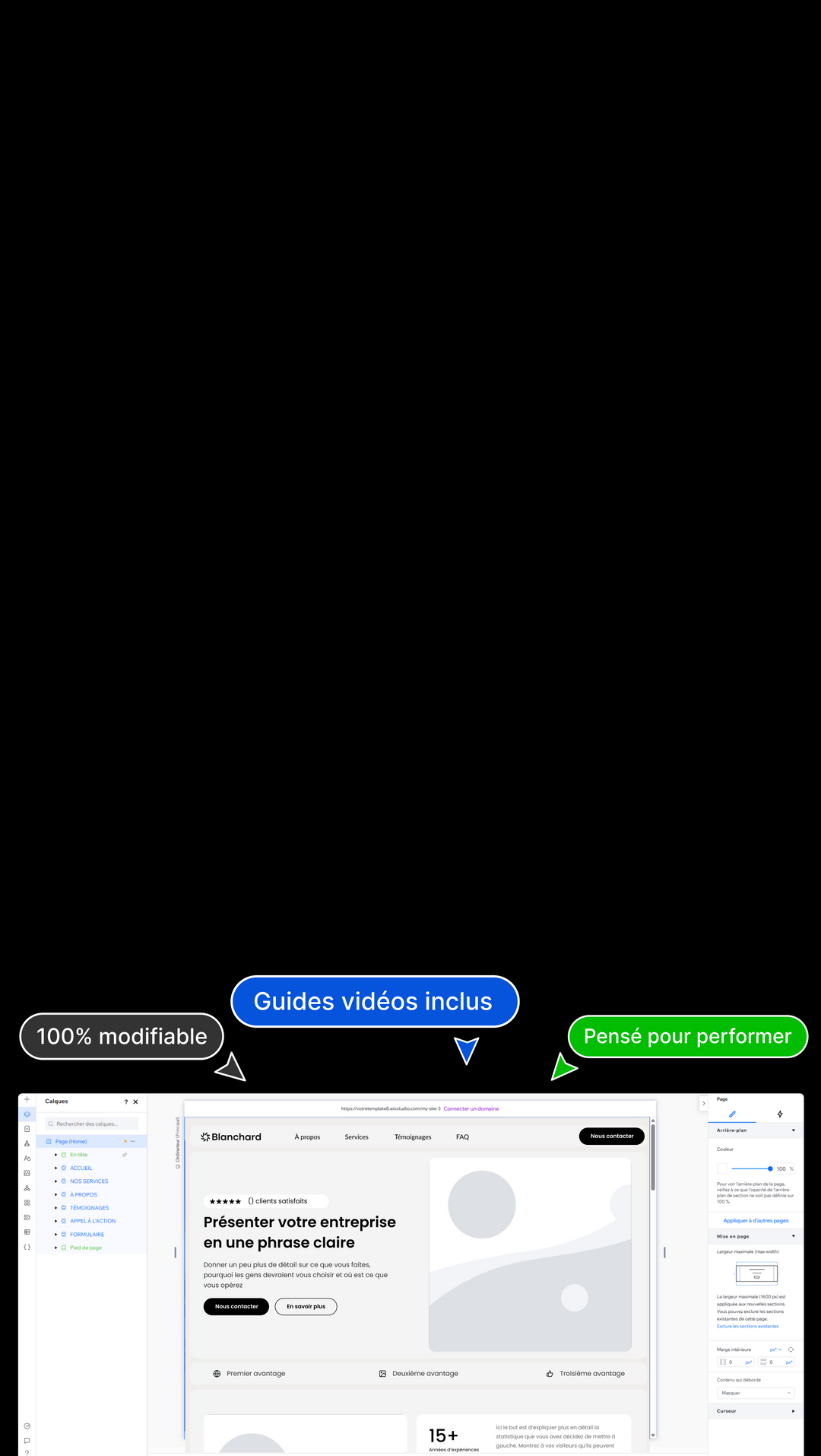Une structure web professionnelle, facile à adapter à votre réalité, peu importe votre industrie et votre secteur. Chaque section est placée stratégiquement pour transformer vos visiteurs en clients.